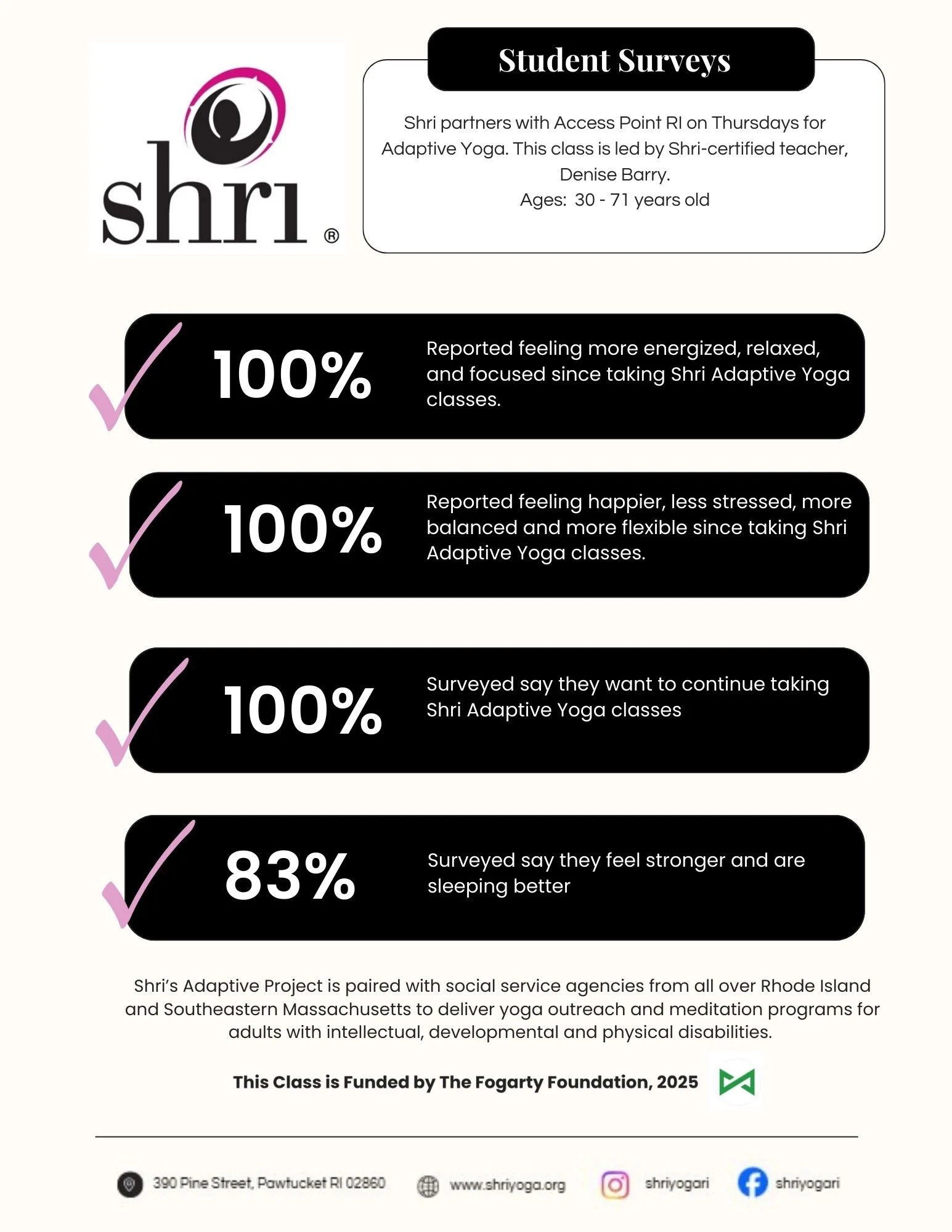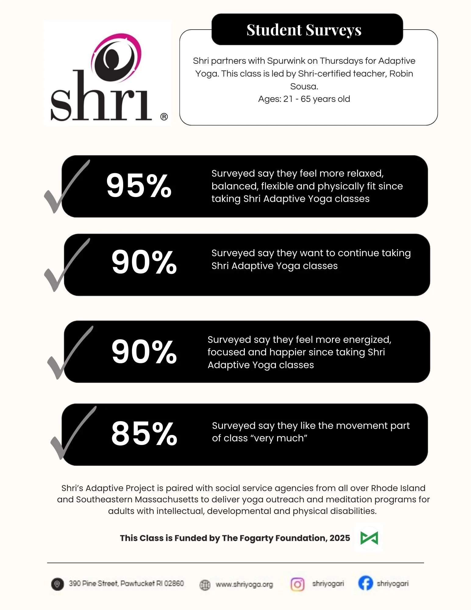 "The Shri adaptive yoga classes have had an amazing effect on our RICLAS participants with disabilities. There has been an obvious improvement in behaviors and attitudes. Breathing and relaxation techniques learned in your classes have become part of our supports at home to create a more peaceful and balanced environment. Our folks look forward to going to class and as a result are happier and healthier. We are grateful to be part of your holistic and spiritual community."