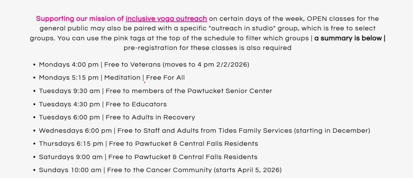 Works with hospitals (for adults and children), free clinics and other health centers to provide yoga classes for patients, families and caregivers in need of balance. Shri has also participated in a medical study with Hasbro Children's Hospital Eating Disorder Unit.